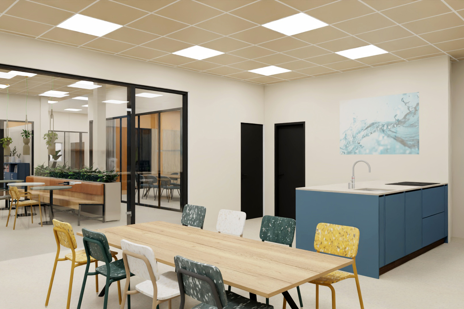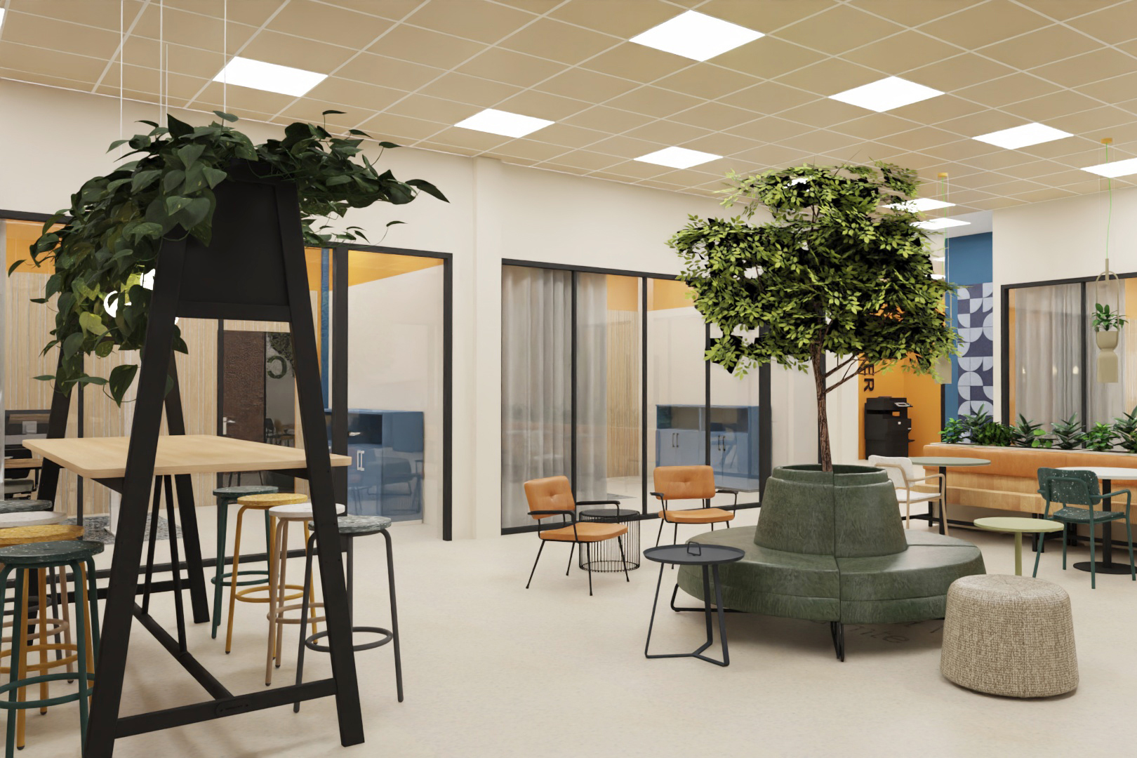 Rondom dit centrale plein hebben we verschillende functies met elkaar verbonden. De kantine, overlegplekken, werkzones en vergaderruimtes lopen in elkaar over zonder dat het rommelig wordt. Door te werken met open kasten, hout, zachte kleuren en veel groen ontstaat een warme en uitnodigende sfeer. Geen traditioneel kantoor, maar een omgeving waar je graag bent.